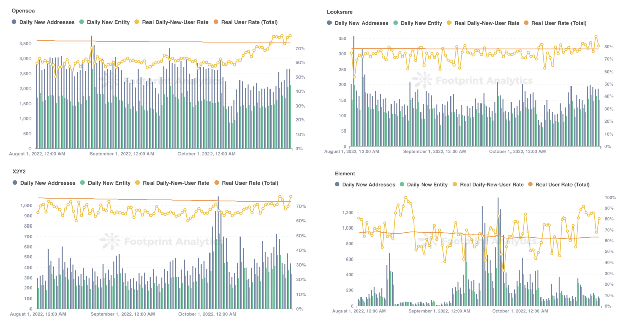 除了Opensea以外下面其他3个nft交易平台都开开展过交易量活动,并都有着相对较高的每日真实用户比例波动,尤其是Element,他在9月、10月期间虽然有很高的新增用户,但真实比例最低只有30%,这意味着用户刷号行为十分严重。刷号行为则可能包括NFT左手倒右手,批量地址购买自己的NFT等行为。从另一个角度来看,Opensea的新增用户真实比例逐渐上升,平台良性发展,带来的结果就是真实的NFT买卖、更高质量的活跃用户和更高的留存率。