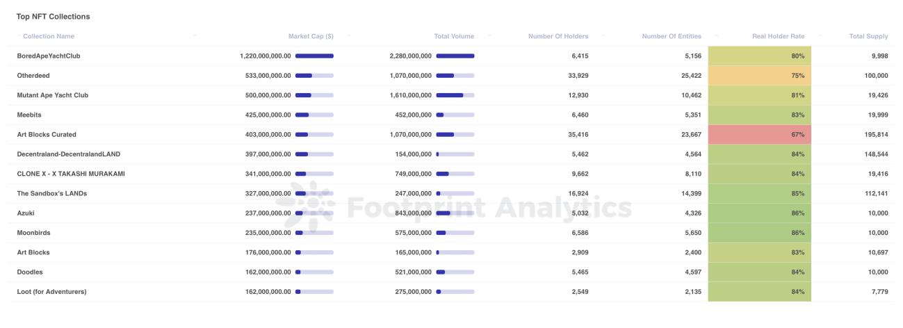 本节将进一步将研究范围缩窄,分析维度变成每个NFT collection,并研究每个collection持有者情况。采用同样的方式,统计目前各个主流NFT系列的持有地址数、持有实体数、以及真实持有者比例。这个比例越低代表了NFT筹码越集中,实际上有少部分人潜在的控制了大量的NFT并不想被人发现。