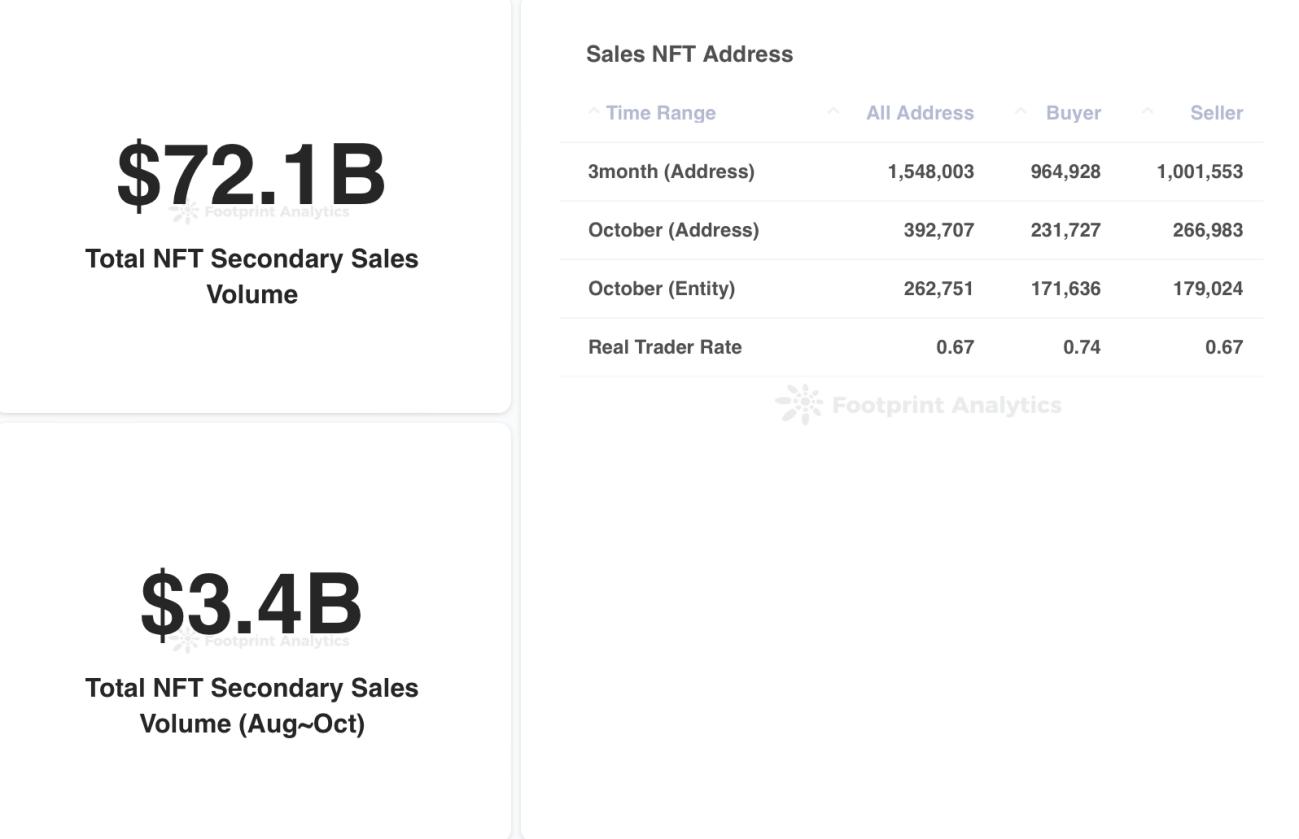 67%代表所有NFT交易地址中,每10个地址可能只有不到7个是是真实的交易者。所以10月的NFT交易者基数大概为0.26M人,并且平均每人的交易额相较于用地址数计算也会有所上升。