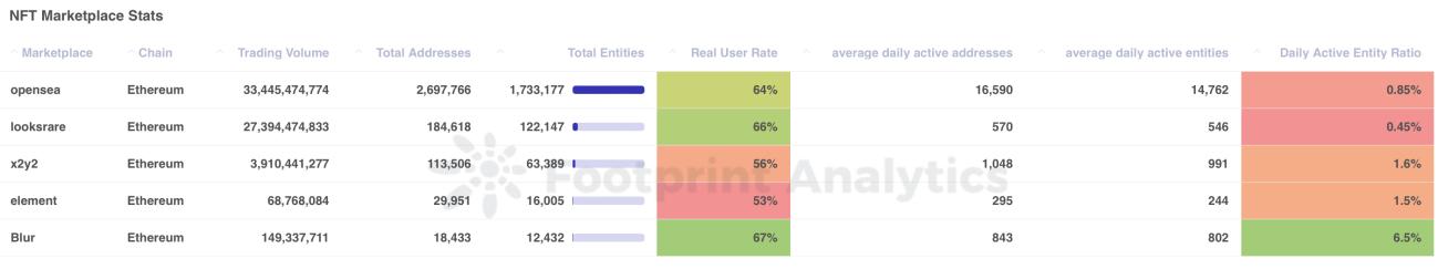 截止2022年11月,以太链上最主要的NFT交易平台分别是Opensea、Looksrare、X2Y2、Blur 和 Element。下图则分析了他们的真实用户比率以及日活情况。