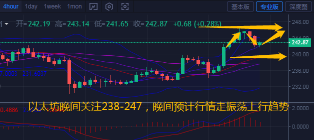 以太坊从四小时级别看,布林带张口向前运行,币价稳定在中轨上方运行,各均线呈多头排列,从四小时级别看,晚间有进一步上行空间,关注238-247区间,操作建议低多为主。