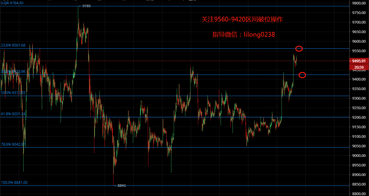一小时级别来看价格早间拉升至9530没有回落,多头情绪高涨,目前价格一直处于9500附近盘整,布林带呈张口姿态,下方各均线支撑开始上扬,价格依托14日均线上行。副图指标MACD于0轴上方有死叉迹象,从下图来看价格多次上行受阻,短期关注9500一线得失。如果今日能够企稳,或将打开新的空间。下方支撑9420,上方压力位9560。操作上回踩多单继续买进。谨慎做空。