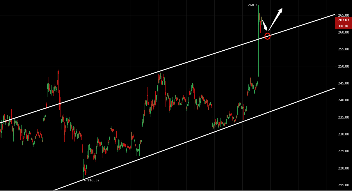 以太坊一小时级别来看价格暴力拉升至268受阻小幅回落,布林带呈张口向上姿态,价格于布林带中轨上方运行,各均线微微上扬,副图指标MACD于0轴上方有死叉迹象,RSI指标三线向下散发。上方压力位270,下方支撑258。