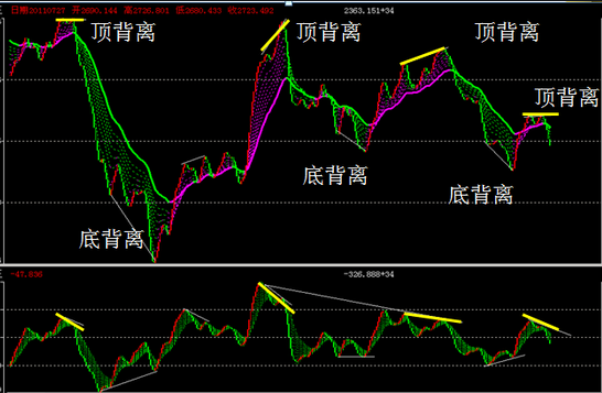 能够形成明显技术指标背离特征的指标有MACD,WR,RSI,KDJ等,其形态都存在与价格背离的特征。