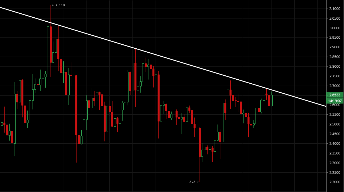 柚子币日线级别目前来看还是比较弱势,价格受趋势线压制运行,目前来看受主流币影响有上破迹象,下方支撑2.57附近,上方压力位2.7,长线继续持有。逢低买进。