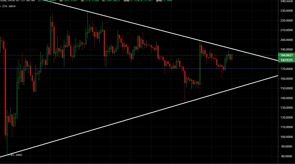BSV日线级别来看和柚子币差不多走势偏弱,自7.6日拉升后一直处于回调状态,关注三角区域运行,上方压力位200,下方支撑位170,高抛低吸为主。
