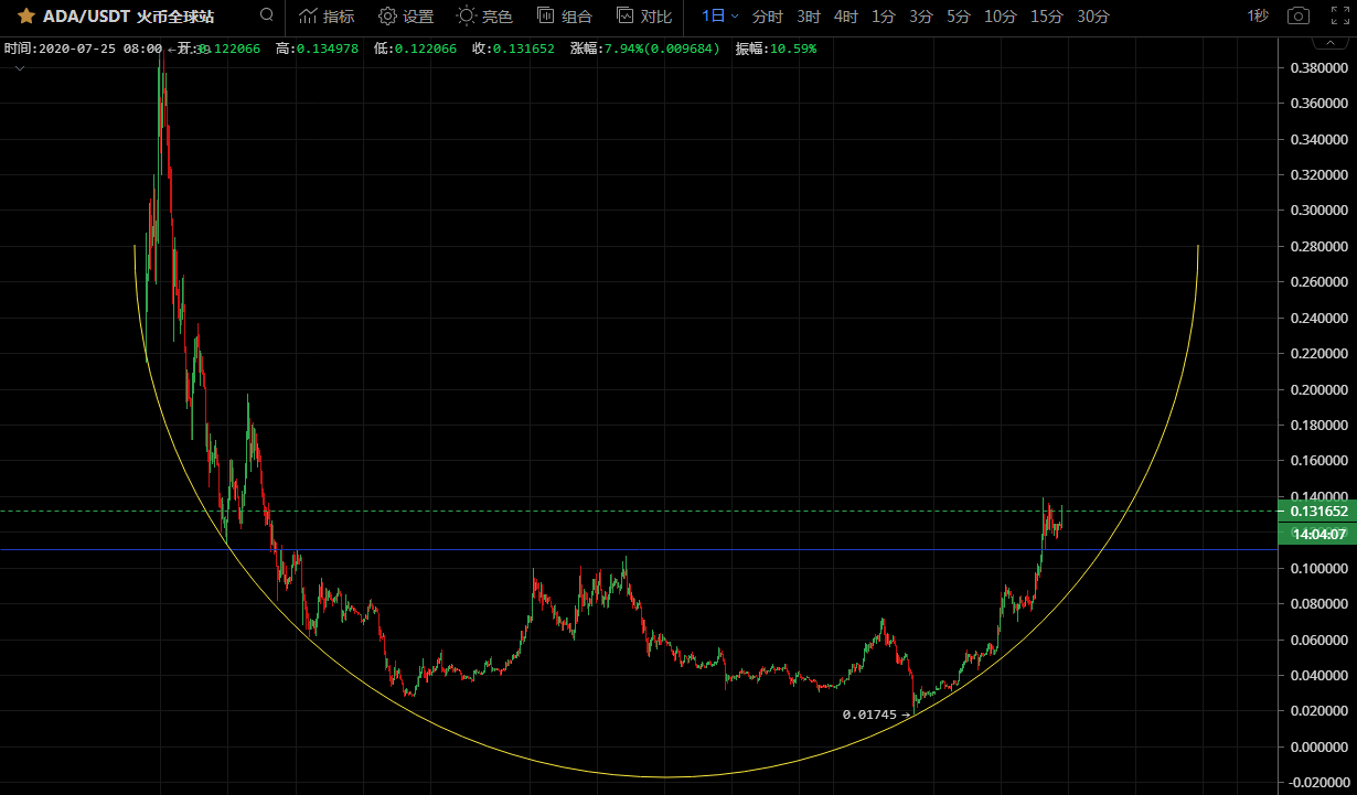 ADA日线级别来看价格构建圆弧底走势,近期受大盘影响走强,关注下方平台支撑0.11,上方压力位0.14。长线可继续持有,回踩下方可以继续买进。