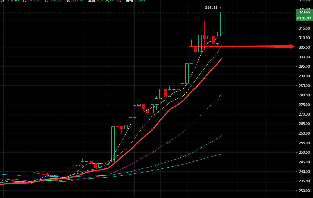 以太坊四小时级别来看布林带呈张口向上状态,价格一路上行至最高点325受阻回落,个均线上扬多头排列,目前价格于布林带上轨附近,副图指标MACD于0轴上方金叉运行,KDJ三线于超买区域向上散发,EMV上穿,下方支撑位306,压力位360。操作上低多为主,高空为辅。
