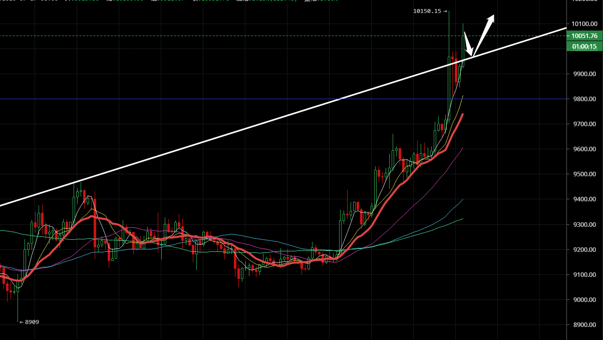 比特币昨日凌晨冲高9730回落,下午价格再次一路拉升,晚间至最高点10150受阻回落至9812,回踩幅度300点左右,今日早间价格再次冲高,目前价格10060美金附近。昨日布局比特币,以太坊多空单成功获利出局