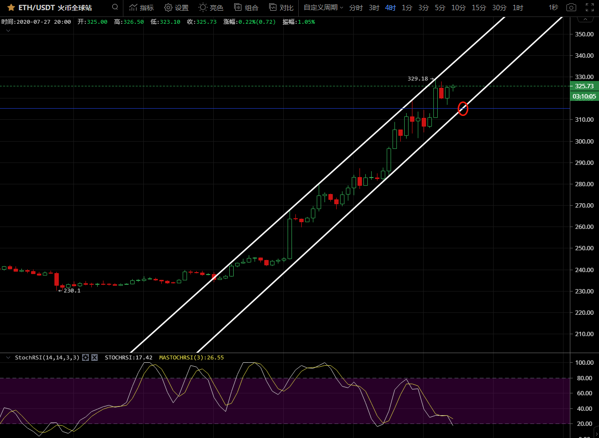 以太坊四小时级别来看价格最近强势拉升一路上行,多次受阻于上轨压力,布林带呈张口状态,各均线呈多头排列上行。10日均线于下方形成有效支撑,副图指标MACD于0轴上方金叉运行,前面走势几次有死叉迹象多次被多头拉回金叉运行,可以看到多头情绪浓烈。KDJ三线于80附近有向上拐头迹象,StochRSI指标于死叉运行,下方支撑位315,上方压力位330-366.5。操作上关注回踩做多为主,高空为辅。