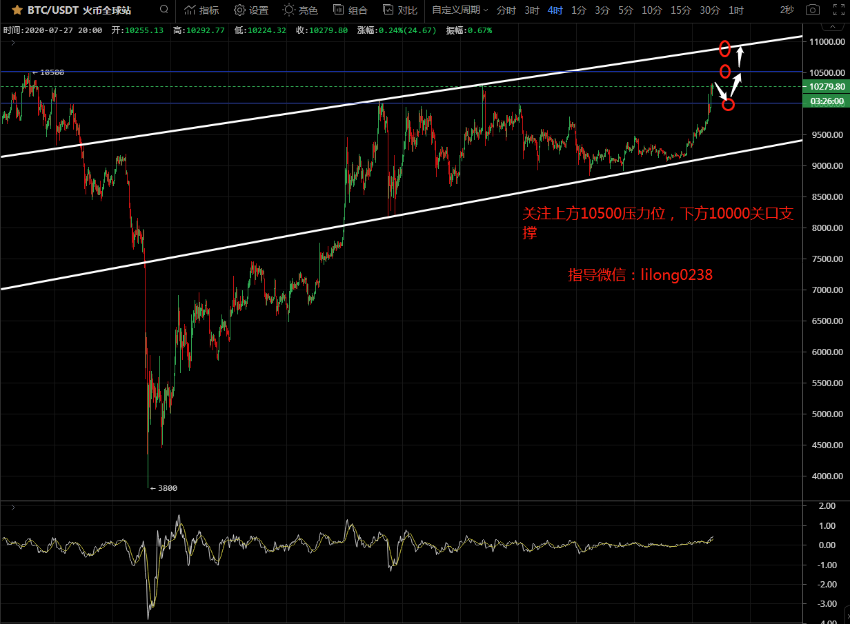 比特币四小时级别来看价格日内三次冲高10300受阻回落,价格早间打破5日均线压力,价格基本稳定于上方运行。布林带呈张口状态,价格于上轨运行。各均线上扬多头排列,大家可以看下运行规律基本上依托14日均线一路上行。副图指标MACD于0轴上方运行,RSI三线平缓运行,KDJ三线于超买区域向上散发,EMV指标上穿持续走高。操作上关注价格依旧有回落风险,趋势还是偏向多头为主。低多为主,高空为辅。