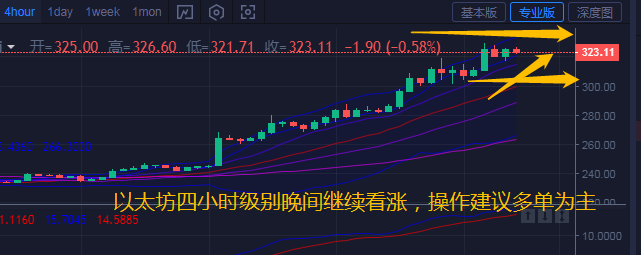 从四小时图上看,布林带张口向上运行,币价稳定在十日均线上方运行,各均线呈多头排列。附图中MACD快慢线拐头向上运行在零轴上方,RSI在78水平线附近向上拐头。汐柔老师预计晚间行情若是能企稳320,说明多头仍然占据很大的优势,晚间还有进一步上行空间,关注320-330,破位看335。