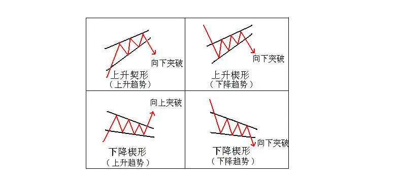 简单的说,上升楔形导致下跌行情的出现,这意味着该形态是看跌形态。