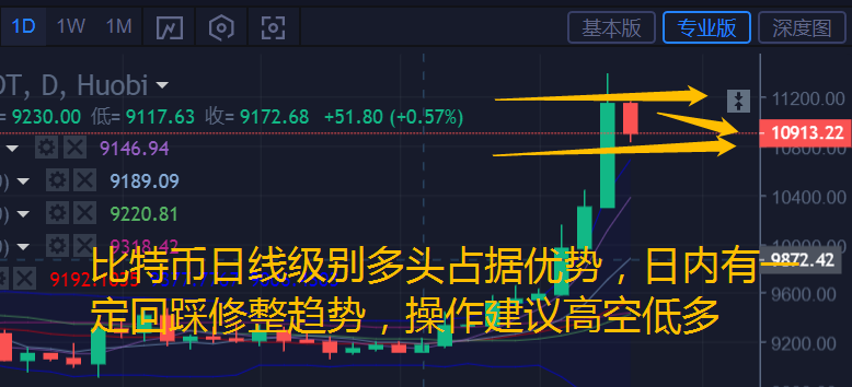 从日线图上来看,K线九连阳之后今日开始回踩,布林带开口向前运行,币价暂时还运行在布林带上轨上方,各均线拐头向上运行趋势放缓,附图中MACD快慢线向上拐头运行在零轴上方,从盘面上看,多头还是占据优势的,但是上行力度不强。操作建议高空低多。