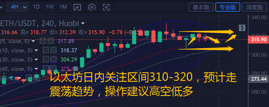 以太坊昨日早间行情再次向上拉升,刷新新高至332.8附近,日内行情有所回踩,下行至305.86后反弹。今日凌晨行情走震荡下行趋势,目前行情稳定在314.9附近。