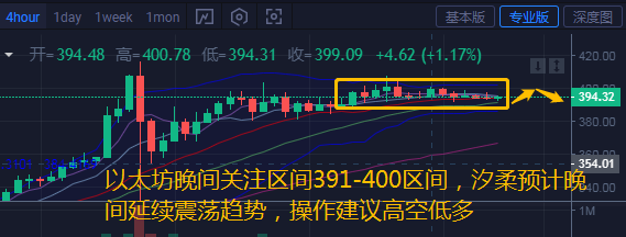 以太坊今日早间向下触及391.5位置后反弹,日内一直在区间390-400之间震荡,目前行情稳定在395.13附近。