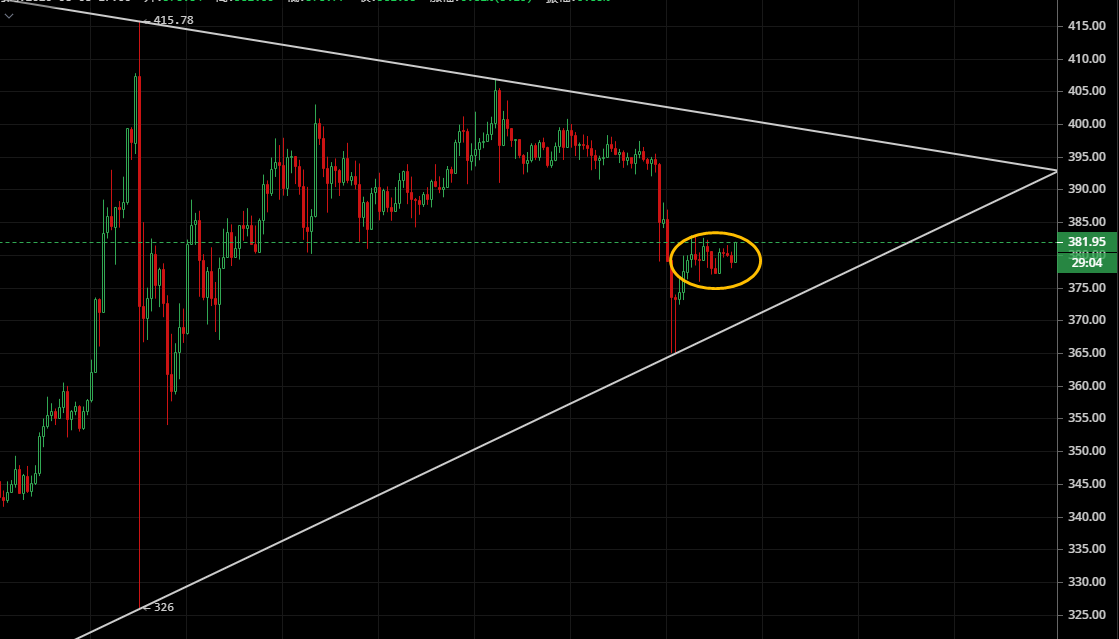 以太坊小时级别来看价格日内于中轨下方380附近震荡,多头持续压制,价格短期运行5日均线和10日均线上方,晚间关注价格能否站上中轨形成支撑。幅图指标MACD于0轴下方金叉运行,EMV指标有下穿迹象,KDJ指标向上散发,晚间操作反弹做空,谨防追涨杀跌。