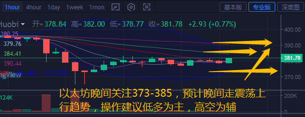 从小时图上看,布林带缩口向下运行,币价正在拉升企稳中轨上方运行,各均线粘合想前运行。附图中MACD快慢线金叉向上拐头运行在零轴上方,RSI在47水平线附近。汐柔预计晚间走震荡上行趋势,日内上方关注五日均线385位置压制,破位看391位置,关注下方支撑373位置。操作建议低多为主,高空为辅。