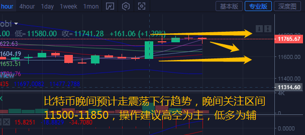 比特币今日凌晨延续昨日的回踩至最低点11322后反弹,日内一直在11500-11650区间内震荡,五点左右行情拉升至最高点11806.19,目前行情稳定在11768附近。