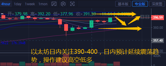 以太坊昨日凌晨回踩至365附近后反弹拉升,日内上行至高点393.52后,今日凌晨继续拉升,早间八点最高点399.90,目前稳定在在395.57附近。