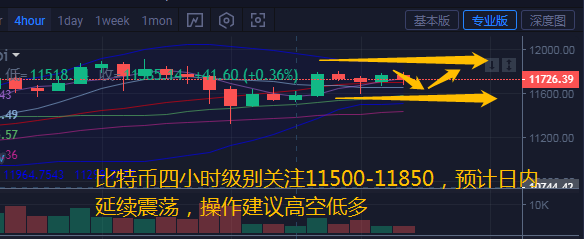 从日线图上看,K线昨日收阳,布林带张口向上运行,币价稳定在十日均线11500上方运行,各均线微微向拐头上运行,附图中MACD快慢线平缓运行在零轴上方,RSI在70水平线附近。从盘面来看,多头仍然占据一定优势。汐柔预计行情日内延续震荡趋势,操作建议高空低多。