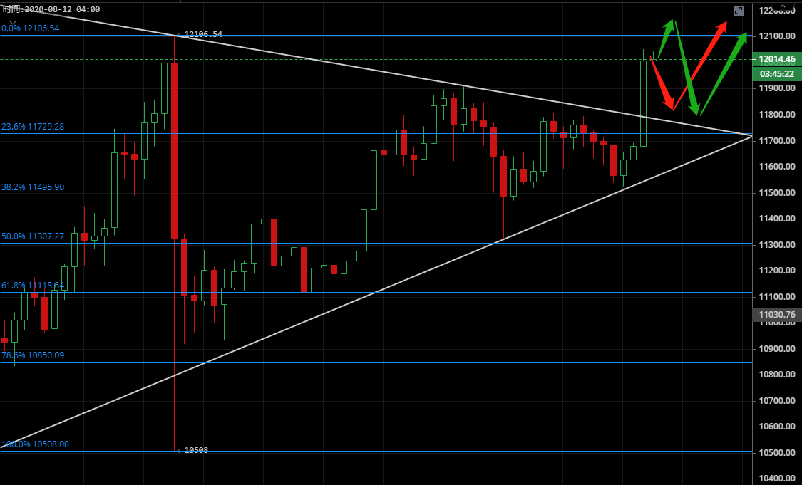 比特币昨日一路阴跌价格最低触及11524美金反弹,价格于今日早间收盘开始向上突破,价格目前最高至12052美金。昨日晚间预测行情先跌后涨布局多空单成功获利出局。