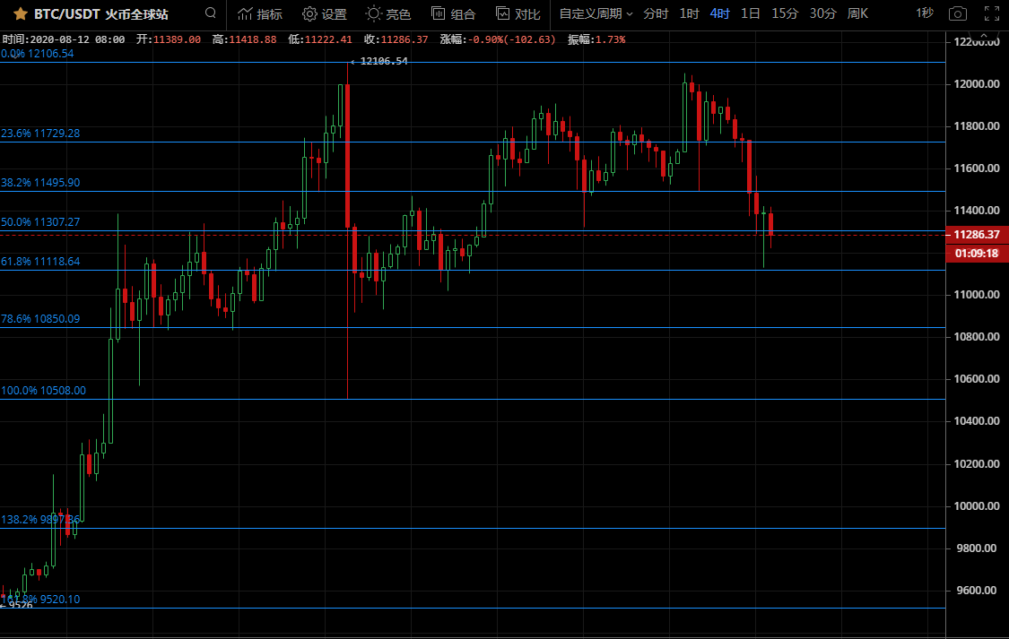 比特币自8.10日插针快速反弹昨日盘面基本上一直处于阴跌,晚间跌破11500支撑,行情今日凌晨跳水至11130小幅反弹,目前价格于11260附近。