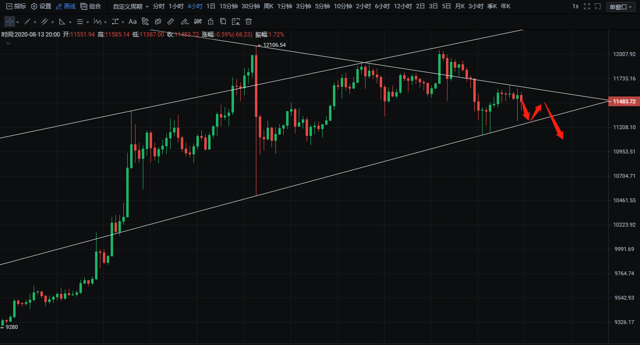 比特币四小时级别来看行情今日日内多次向下插针反弹,目前行情还处于震荡,价格于中轨下方运行,各均线缠绕运行,价格继续于三角区域震荡,幅图指标MACD于0轴下方快慢线重合,RSI指标三线向下散发,KDJ指标向下拐头运行,下方支撑位11130美金,上方压力位11650美金。价格还有回调需求,操作上高空为主,低多为辅。