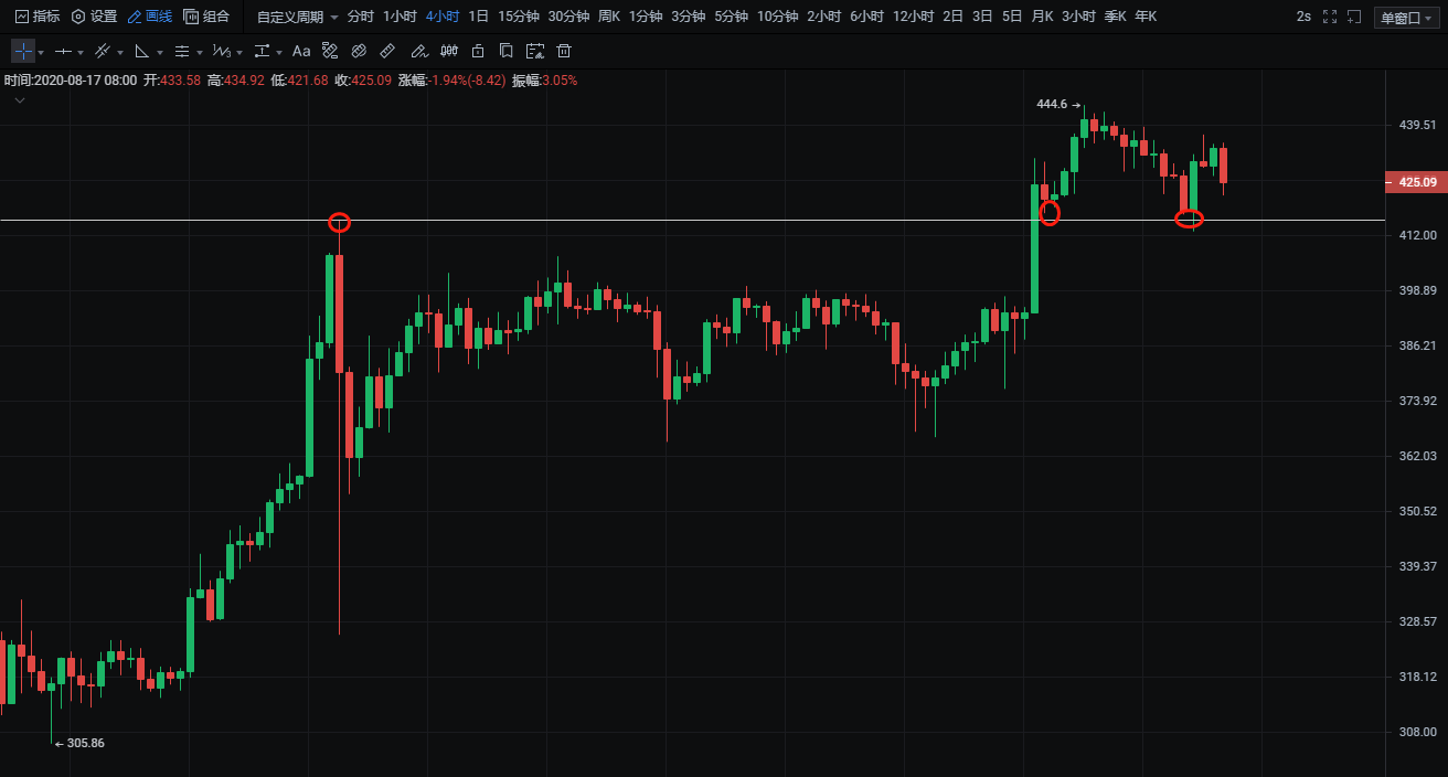 以太坊四小时级别来看价格昨日下午小幅回调至布林带中轨反弹,布林带呈缩口向下状态,日内关注下方30日均线支撑效果,目前并没有出现大幅度回调,幅图指标MACD于0轴上方死叉运行,RSI指标三线拐头向下运行,KDJ指标三线向下散发,上方压力位440,下方支撑位415。操作上高空低多为主。