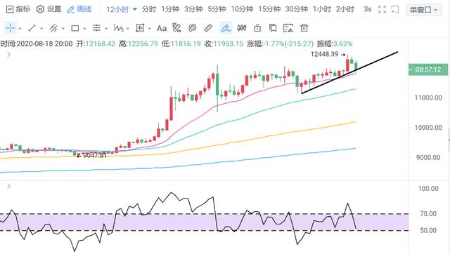尽管12000关口被下破,那么BTC晚间价格在11830美元处也就是20均线处得到了支撑,中期还是看涨,目前价格在11980美元处徘徊,另外需要关注的是这根黑色支撑线,如果12小时收线有效跌破11920,那么明天我的思路会以空为主,此外,RSI已经触及50水平线,如果明天跌破,那么看空也是顺理成章的事情。
