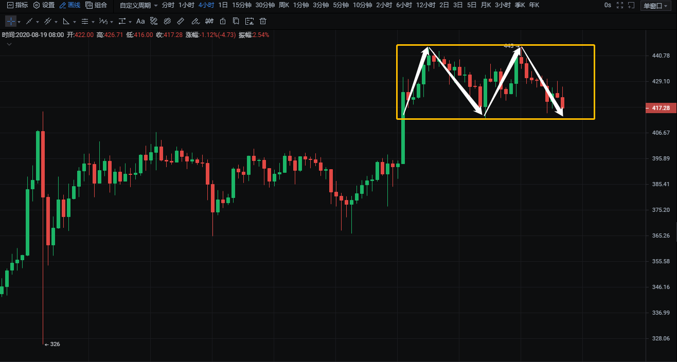 以太坊四小时级别来看价格两次上行至445受阻回落,类似M头形态,布林带呈张开形态,价格于下轨附近运行,价格受均线压制走低。幅图指标MACD于0轴附近死叉运行,RSI指标三线向下拐头,EMV指标下穿运行。上方压力位430,下方支撑位410,操作上高空低多为主。