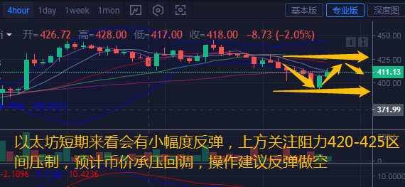 以太坊昨日凌晨维持震荡下行趋势,午间两点左右回踩至最低点402后小幅度反弹。今日凌晨四点行情再刷新低至393.53后反弹,目前稳定在在412.80附近。