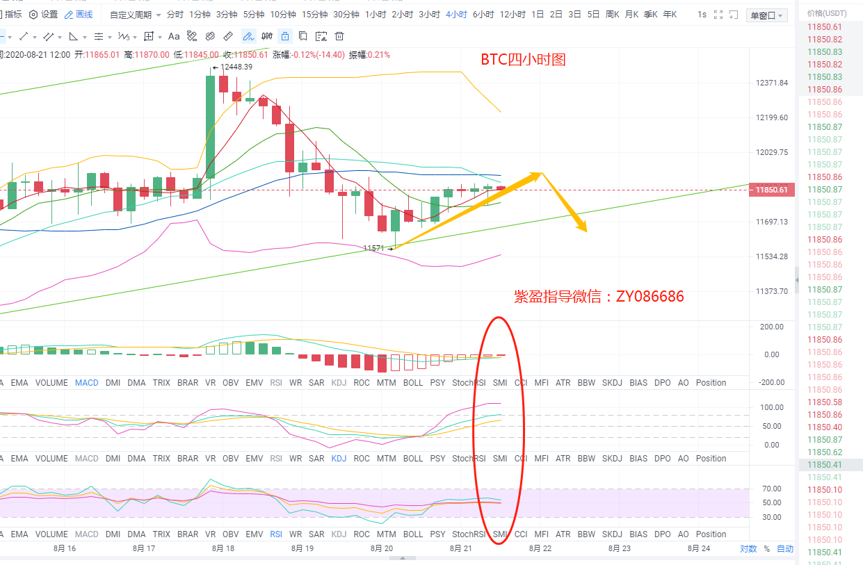 昨晚给出文章提到先涨后跌,策略反弹做空成功止盈,今天思路不变,大趋势看好空头,反弹做空为主。比特币四小时级别来看,布林带通道呈收口状态向下运行,币价自昨天凌晨下跌触及11571一线支撑后,开始反弹从下轨附近运行至中轨附近,均线方面,比价目前沿5日均线运行,下方10均线有短期支撑作用,30日均线在比价上方走平,也是目前币价承压点,MACD快慢线在0轴附近粘合运行,红色动能柱缩量,KDJ三线在100附近有拐头迹象,RSI在50附近聚合,有死叉迹象,综合来看日内看回踩概率较大,上方关注11930附近阻力,下方11700支撑,操作上高空低多即可。