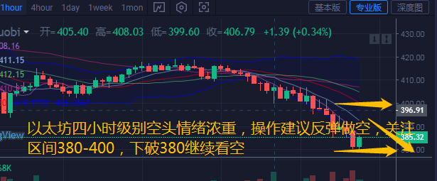 从四小时图上看,布林带张口向下运行,币价跌破下轨支撑运行在其下方,各均线拐头向下运行。附图中MACD快慢线拐头向下运行在零轴下方,红色动能柱持续放量,RSI在29水平线附近向下拐头。日内空头情绪稍重,汐柔预计走震荡下行趋势,操作思路反弹做空。上方关注400位置压制,关注下方支撑375位置,跌破继续看空。操作建议空单为主。