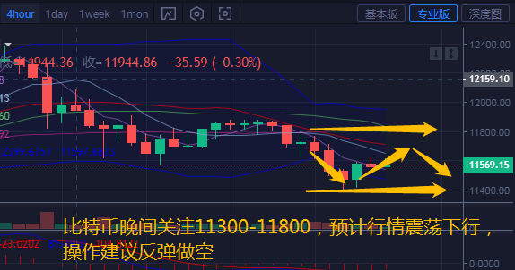 从小时线图上看,布林带缩口向前运行,币价向上试探与运行至中轨上方运行。五日均线上穿十日均线运行。附图中MACD快慢线金叉运行在零轴下方,RSI在47水平线附近向下拐头。从盘面来看,汐柔认为短期行情有一定的反弹趋势但力度不强,操作思路反弹做空,晚间整体预计走震荡下行趋势。汐柔建议关注下方11300附近支撑,上方阻力关注11700-11800附近。
