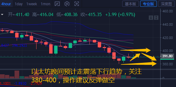 从四小时图上看,布林带张口向下运行,币价重新回到布林带通道内运行,各均线拐头向下运行。附图中MACD快慢线拐头向下运行在零轴下方,RSI在35水平线附近。日内空头情绪稍重,短期内有一定反弹的趋势,汐柔预计晚间走震荡下行趋势,操作思路反弹做空。上方关注400位置压制,关注下方支撑380位置,跌破继续看空。