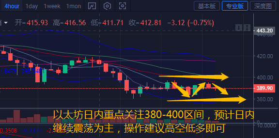 以太坊昨日凌晨上行至高点396.97后持续震荡下行回踩至最低点383.33后反弹。今日凌晨上行至最高点395.15后小幅度回踩,目前稳定在中轨389.62附近。