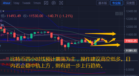 从日线图上看,K线昨日收阳,布林带缩口向前运行,币价向上试探于中轨附近。五日均线下穿十日均线向前运行。附图中MACD快慢线向下拐头运行在零轴上方,RSI在54水平线附近。汐柔认为盘面多空力量均衡,预计日内走震荡趋势。重点关注日内能否突破中轨11750附近压制,操作建议高空低多即可。汐柔建议关注下方11500附近支撑,上方阻力关注11800附近。