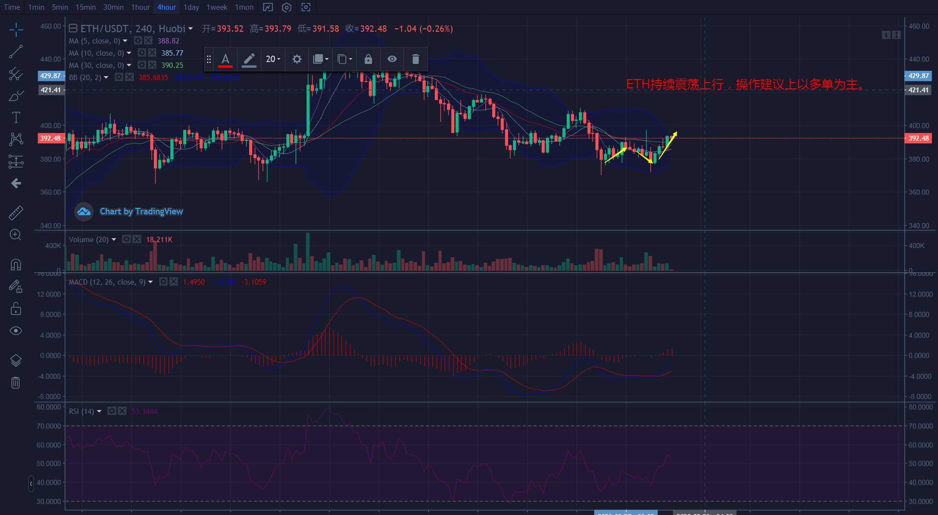 来看看晚间的行情,从日线上看,k线向布林带中轨运行,kdj三线交叉形成金叉,多头持续放量。从4小时线图看,目前已经站上布林中轨,重心上移明显,技术上布林通道不断收口,MA5均线上穿MA10均线形成金叉,MACD快线和慢线拐头向0轴靠拢,多头势能持续放量,KDJ拐头向上发散,短期多头依然强势,晚间关注390上方能否企稳。