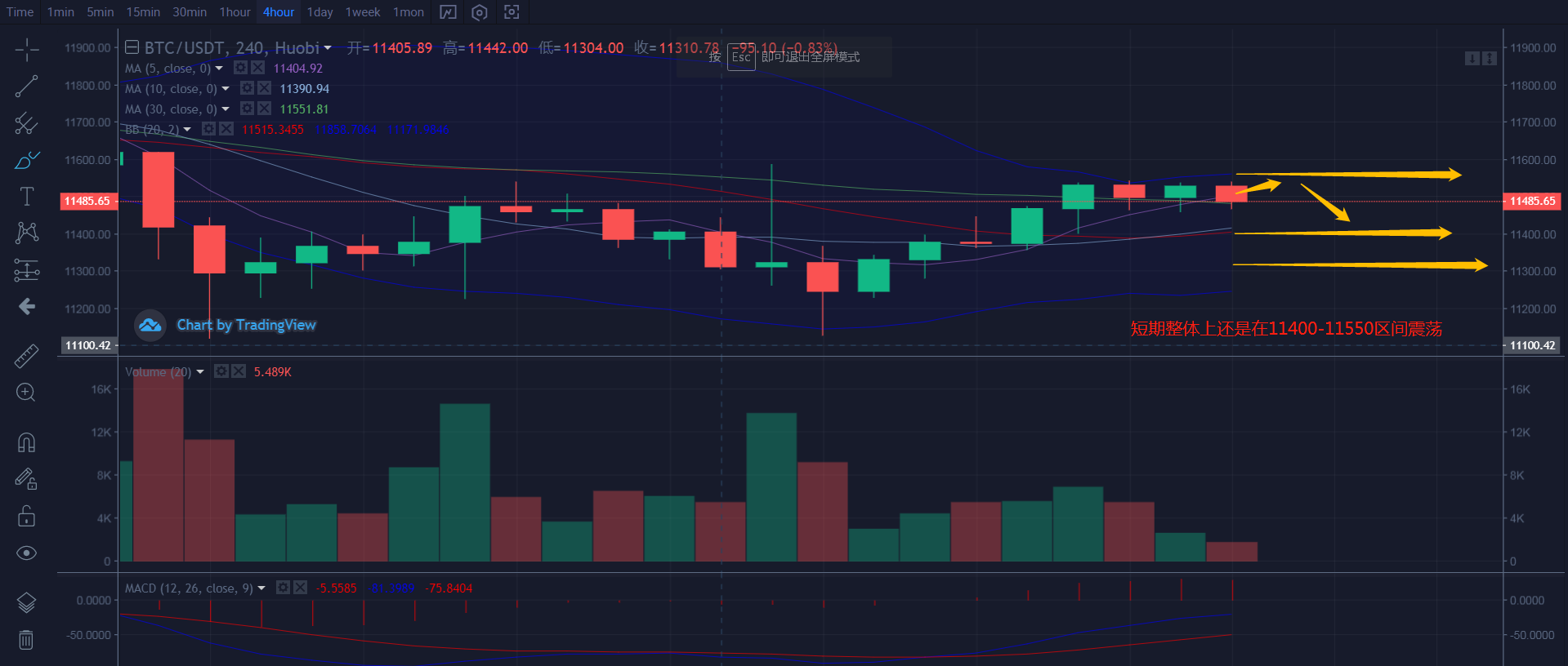 从4小时图来看,昨日天地针虚破趋势线,又快速回落到布林带中轨下方,目前布林带呈收口状态,目前虽走出一波上行趋势,突破中轨,明显看出走势并不强烈,上行动力略微不足,回落的概率较大。 上方压力依然关注11550,下方支撑11400和11320。