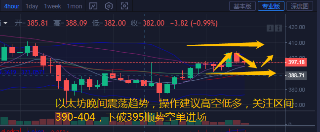 从四小时图上看,布林带张口向上运行,币价稳定在十日均线上方运行,五日均线上穿十日均线运行。附图中MACD快慢线金叉向上运行在零轴附近,绿色动能柱放量,RSI三线走平在56水平线附近。整体来说,目前行情震荡,多空力量均衡,汐柔预计晚间走震荡趋势,操作建议高空低多。上方关注404位置压制,关注下方支撑390位置。