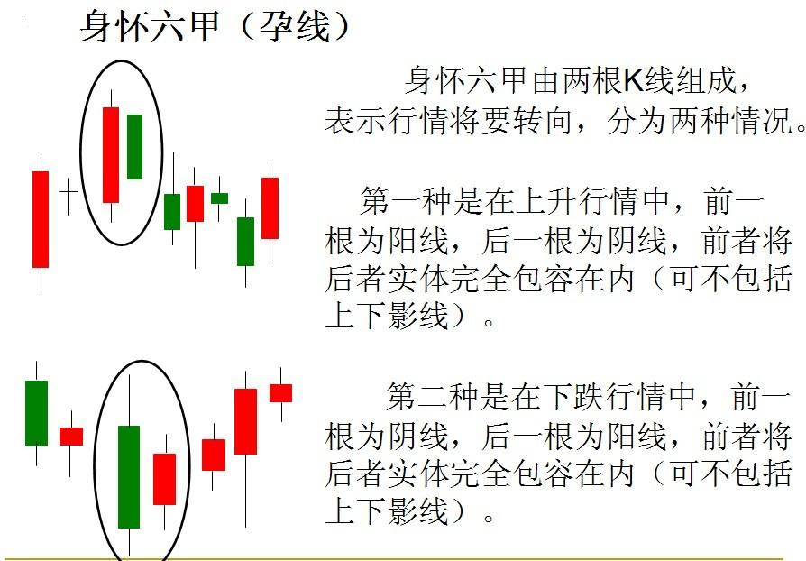 3、孕育线分两种情况,一是阳线缩在前几天较长的阳线之内,即连续数天扬升之后,隔天出现一根小阳线,并完全萎缩在前日之大阳线之中,表示上升乏力,是暴跌的前兆。