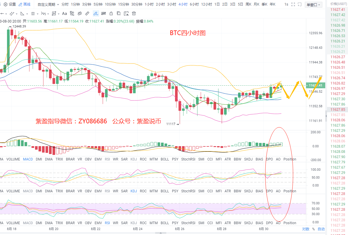 比特币日线级别看,自12448以来,走势都是围绕阴阳反转的走势,来回修复,多空胶着,都没能有突破性走势。四小时级别当前币价拉升受阻与上轨后有所回落,在11600附近震荡,看图可见下方各均线呈多头上扬排列,并且在下方形成支撑。MACD快慢金叉后在0轴上方开口运行,KDJ三线向上发散,RSI开口移动。综合来看晚间多头趋势明显,但是量能未能跟上,晚间大幅度上涨可能较小,偏向震荡上行走势,期间承压回落可以博短空,稳健等待收周线在考虑进场。