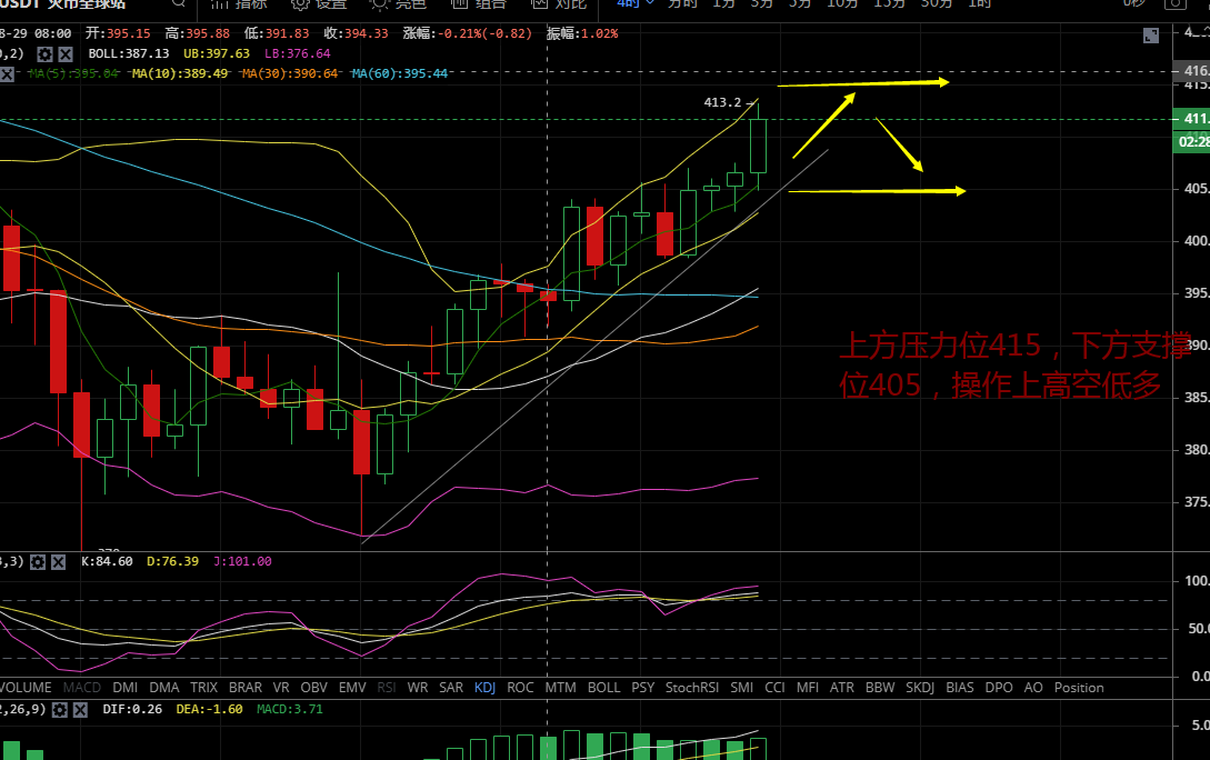 ETH行情分析:ETH晚间一路上行至412附近,从四小时看布林带呈张口运行,k线运行在布林带上轨,macd双线形成金叉在零轴上方运行,kdj三线形成金叉上行。上方压力位415,下方支撑位405.操作上高空低多