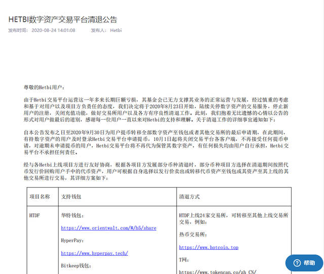 根据交易所的公告:由于Hetbi交易所运营这一年多来长期巨额亏损,其基金会已无力支撑其业务的正常运营与发展,经过慎重的考虑和基于对用户以及项目方负责任的态度,我们决定将于2020年8月23日开始,陆续关停数字资产的交易服务...