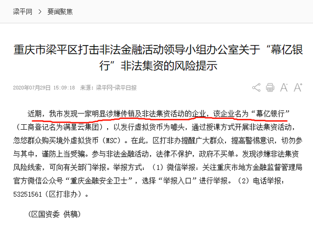 重庆市梁平区打击非法金融活动领导小组办公室关于幕亿银行非法集资的风险提示:近期,我市发现一家明显涉嫌传销及非法集资活动的企业,该企业名为“幕亿银行”(工商登记名为满星云集团),以发行虚拟货币为噱头,通过授课方式开展非法集资活动,忽悠群众购买境外虚拟货币(MSC)。