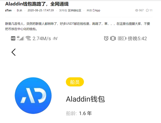 一个名叫阿拉丁钱包的中心化钱包。根据相关用户的信息显示,群里几百号人,突然就把群里的人都给删除了。