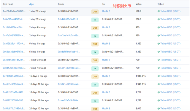 从8月8号就以开始疯狂转移了上千万USDT,转移后通过分散多个地址,分别将资产转移到火币地址,疑似已经开始大量套现。如下图所示,已经转出去超过千万的USDT。