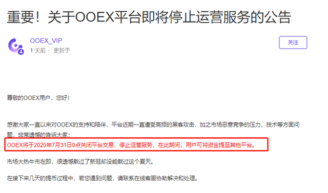 感谢大家一直以来对OOEX的支持和陪伴,平台近期一直遭受高频的黑客攻击,加之市场恶意竞争的压力、技术等方面问题,非常遗憾的告诉大家:OOEX将于2020年7月31日0点关闭平台交易,停止运营服务,在此期间,用户可将资金提至其他平台。