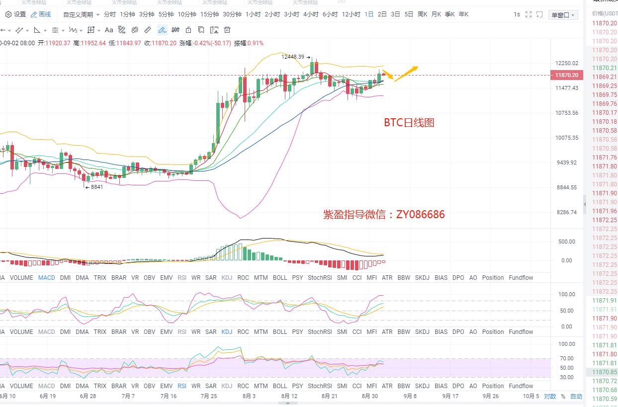 比特币四小时级别来看,布林带呈收口状态,币价当前运行在上轨下方,看均线方面,昨天强势拉升后币价站上各均线上方,凌晨至现在币价有所回落,目前跌破5日均线,10日均线有短期支撑效果,强支撑在30日均线附近,MACD快慢线在100附近收口快线拐头向下,有死叉迹象,绿色动能柱明显缩量,KDJ三线向下发散,RSI在50附近聚合向下运行,小周期四小时级别来看日内走势回落调整为主,毕竟刚刚大涨过后的行情有些疲软,日内白盘继续上攻阻力的概率不大,关注下方支撑11700,上方阻力在12150,操作上顺应多头市场,低多为主,(想要避免爆仓和套单尽量少做或者不做逆市单子,越是做逆市单你的亏损率越大)
